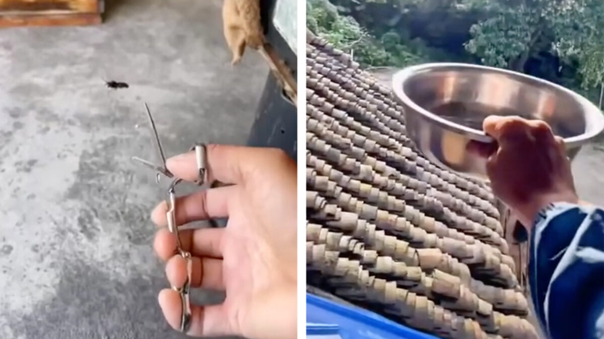 Imker beschermt zijn bijennest tegen een groepje vijandige hoornaars Dieren