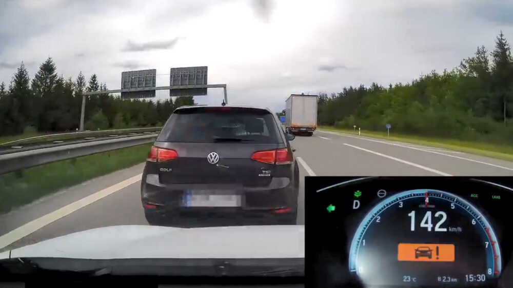 Blijkbaar was onze Golf druk in de weer met zijn telefoon terwijl hij tijdens zijn auto de linkerbaan op stuurt. Ondanks de snelheid van 200+ km/u weet deze oplettende dashcammert nog nét een botsing te voorkomen. Je weet dat het pas echt serieus is als je geen tijd hebt om te toeteren...