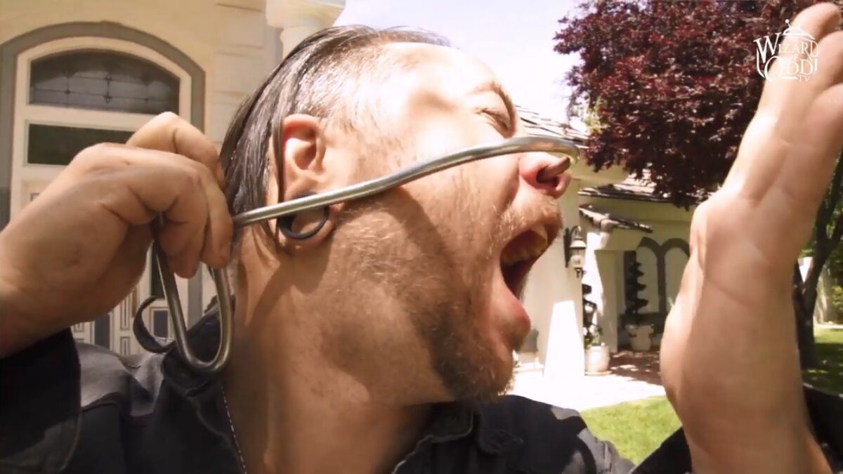 Mafkees sleept zijn auto met een vleeshaak door zijn gezicht