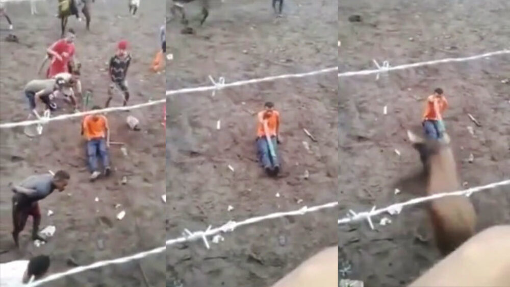 Kerel krijgt precies wat hij verdient als hij een stier zittend met een stok uitdaagt