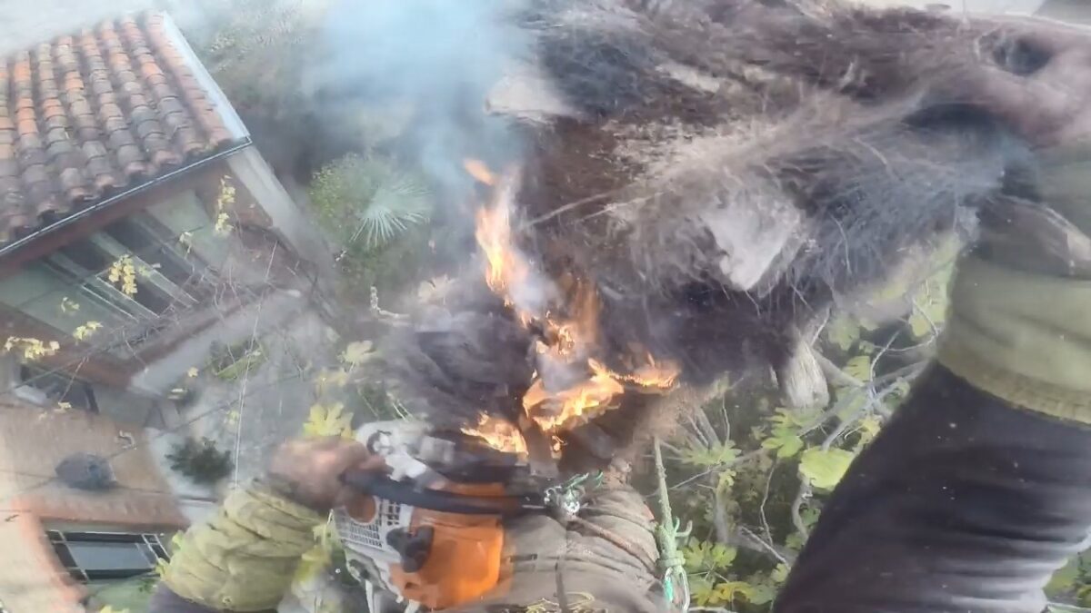 Franse houthakker zet hele palmboom in lichterlaaie met zijn kettingzaag
