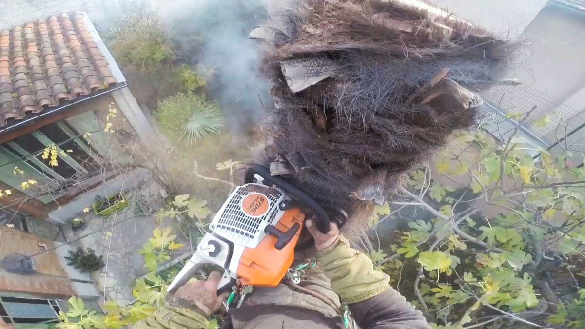 Franse houthakker zet hele palmboom in lichterlaaie met zijn kettingzaag Random