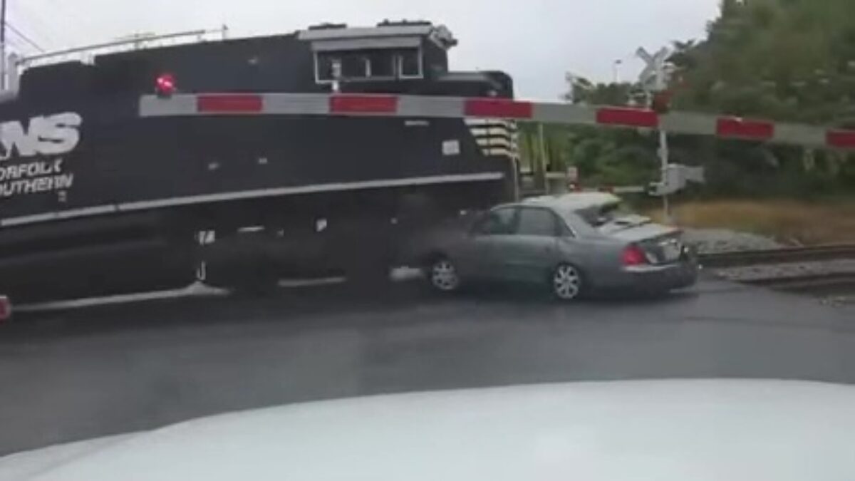 Amerikaanse dame weet haar auto precies tussen de slagbomen te parkeren