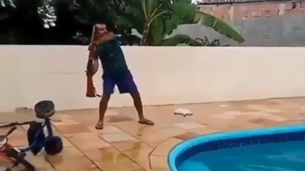 Zwembad-terrorist komt erachter dat zijn geweer flink wat terugslag heeft