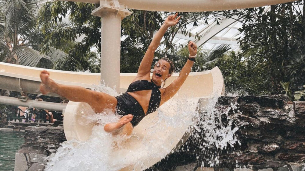 Ook Victoria Koblenko is wel eens aan vakantie toe en zo ging ze afgelopen weekend met het hele gezin (gegarandeerd gesponsord) richting Center Parcs. Allemaal prima natuurlijk, en zo moest ook de glijbaan even getest worden. Glibberen maar!