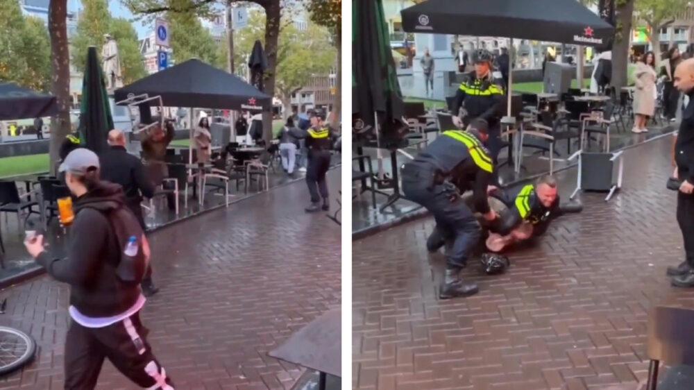 Doorgedraaide driftkikker bekogelt agente met kruk op Rembrandtplein, wordt hardhandig naar de grond gewerkt