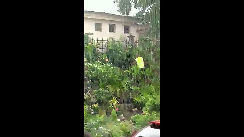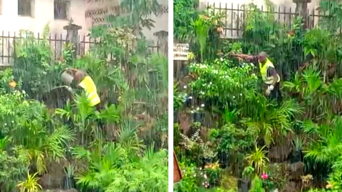 Sommigen zullen zeggen dat hij een idioot is om tijdens een enorme stortbui de planten water te geven, anderen noemen het TOEWIJDING!