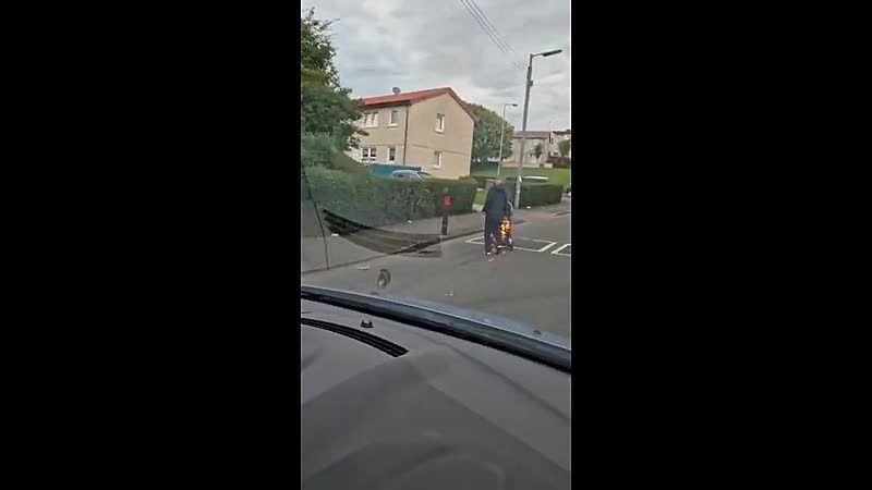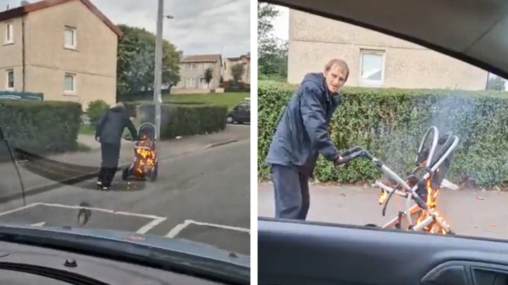 Niets aan de hand, hij maakt gewoon een wandeling met zijn brandende kinderwagen