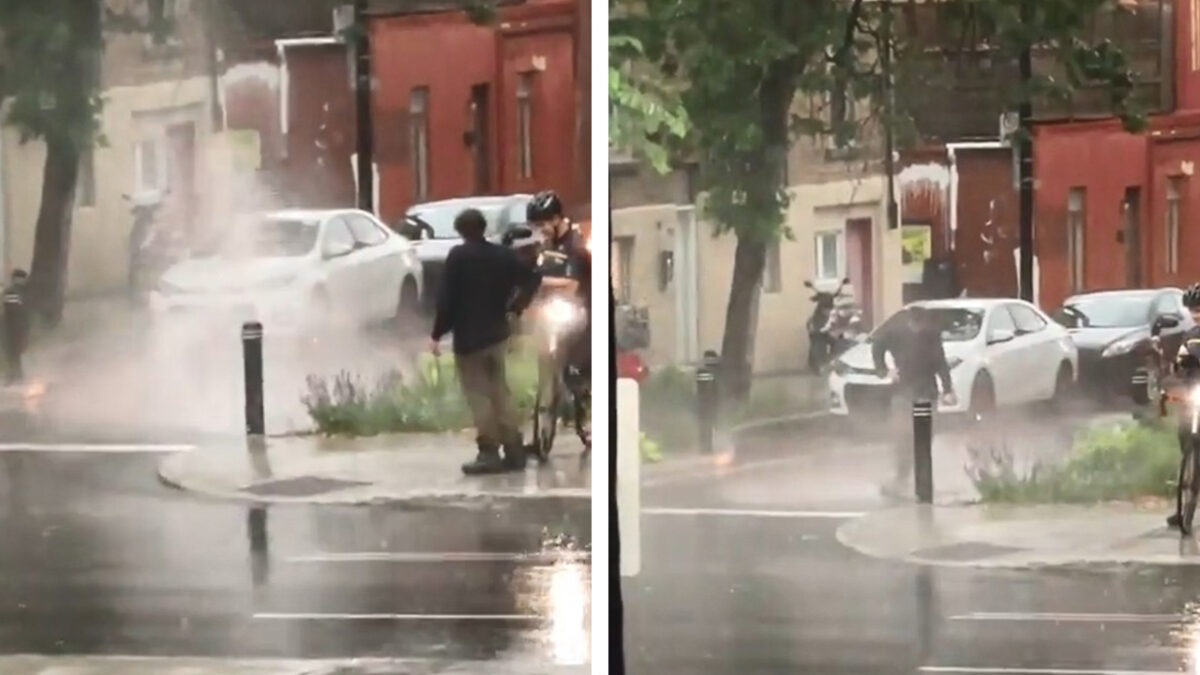 Een bezorgde burger besluit zich van z'n beste kant te laten zien door een putdeksel met ADHD aan te trappe... Krijg nou de vinkentering. Die is nat tot zijn slip!