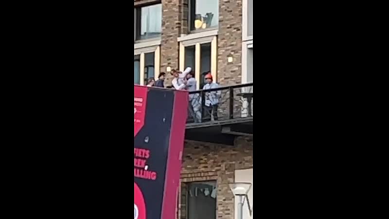 Egbert-Jan en Roderick op het balkon van Vindicat met elkaar op de vuist