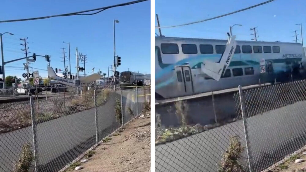 Dubbel pech: vliegtuig maakt noodlanding op treinrails en wordt daarna door trein gebeukt