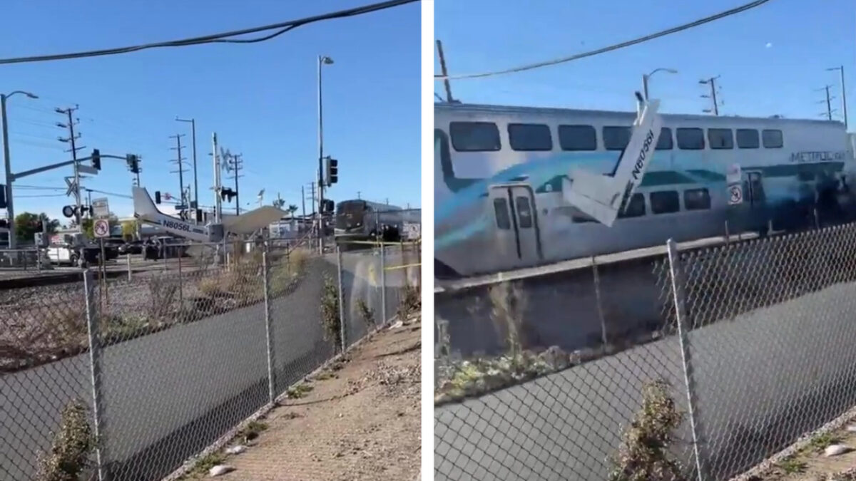 Dubbel pech: vliegtuig maakt noodlanding op treinrails en wordt daarna door trein gebeukt