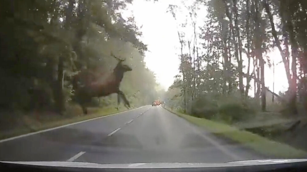 Je ziet wel eens van die borden staan, waarop je wordt gewaarschuwd voor overstekende herten. Je ziet ze echter zelden, maar deze bestuurder maakte kennis met iets veel zeldzamers: vliegende herten. Zo'n 130 kilo schoon aan de haak, dus dat wil je niet voor je auto hebben...