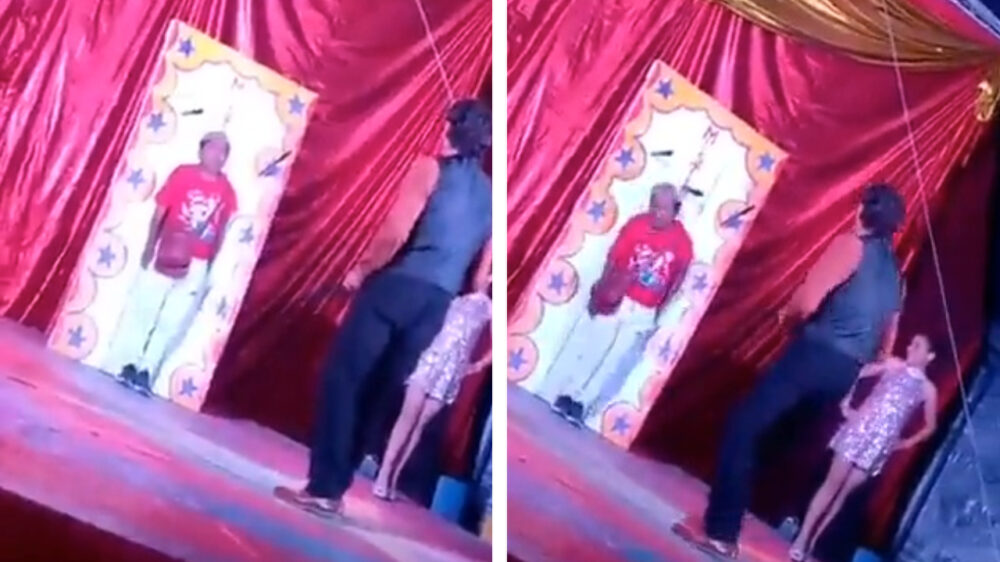 Het is normaal gesproken altijd zaak om zo stil mogelijk te staan als je vrijwilliger bent bij dit soort acts, maar deze dame dankt haar leven aan het feit dat ze wegdook.