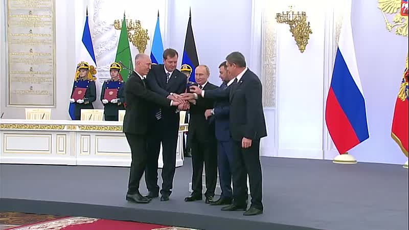 Zojuist heeft Vladimir Poetin zijn speech gehouden en documenten ondertekend waarmee hij de vier bezette Oekraïense provincies Kherson, Zaporizhzhia, Luhansk en Donetsk officieel annexeert. Zo'n belangrijke stap vraagt natuurlijk om een klein feestje en de hele zaal scandeert gebroederlijk: "Rusland, Rusland, Rusland!".