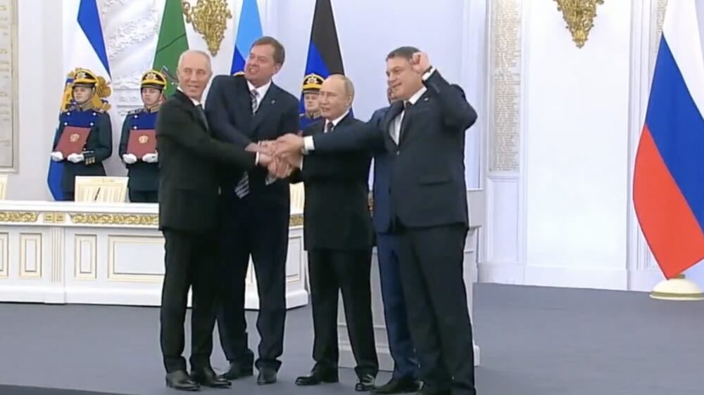 Zaal viert feestje nadat Poetin officieel bezette Oekraïense provincies annexeert