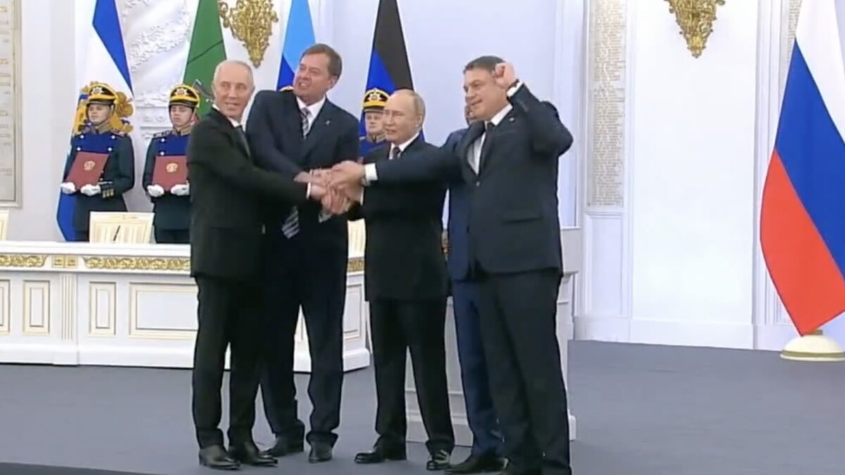 Zaal viert feestje nadat Poetin officieel bezette Oekraïense provincies annexeert Nieuws