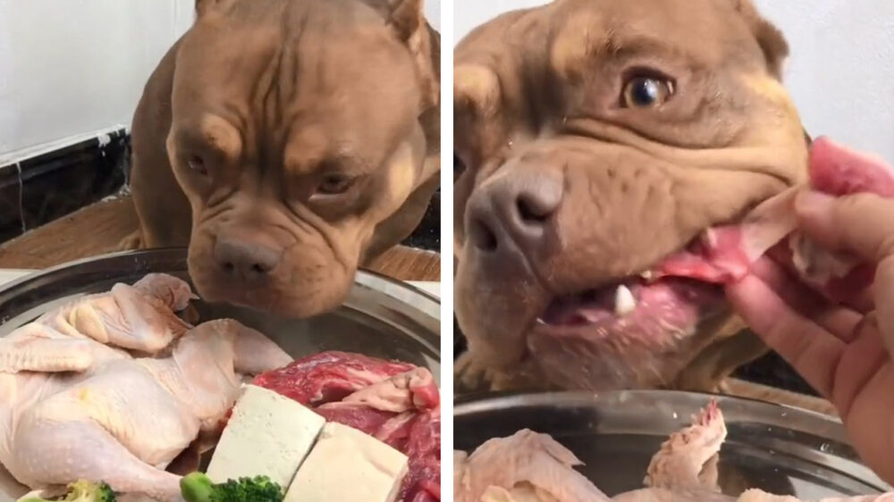 Hondenliefhebbers en/of ASMR enthousiastelingen kunnen hun geluk niet op als ze dit smikkelfestijn zien en horen. Op het menu staat rauwe kip, rundvlees, tofu en wat broccoli voor de aanbevolen vitamientjes. Laat het u smaken.