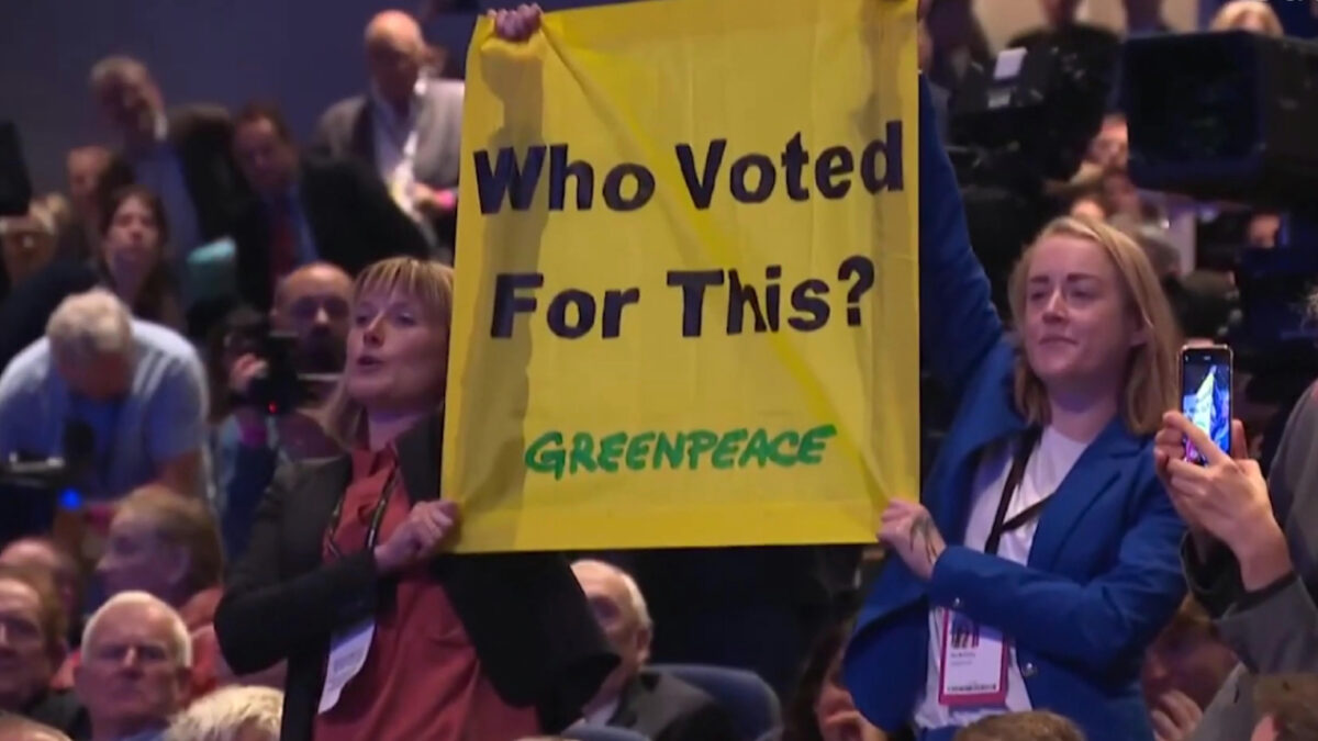 Speech Liz Truss onderbroken door de best voorbereide Greenpeace-demonstranten ooit