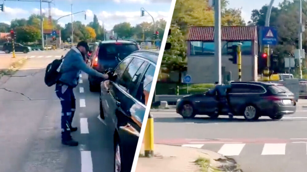 Fietsbelg sloopt zijspiegel BMW en wordt meters meegesleurd aan de auto