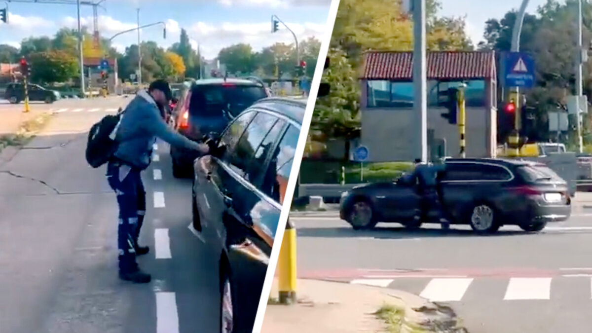 Fietsbelg sloopt zijspiegel BMW en wordt meters meegesleurd aan de auto