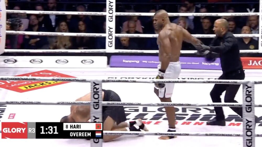 Overeem krijgt Badr Hari na 3 ronden op de knietjes die ook meteen zijn afscheid aankondigde