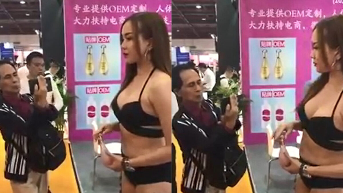 Ouwe snoepert is zeer gecharmeerd van 'producten' dat reclamemeisje aanprijst