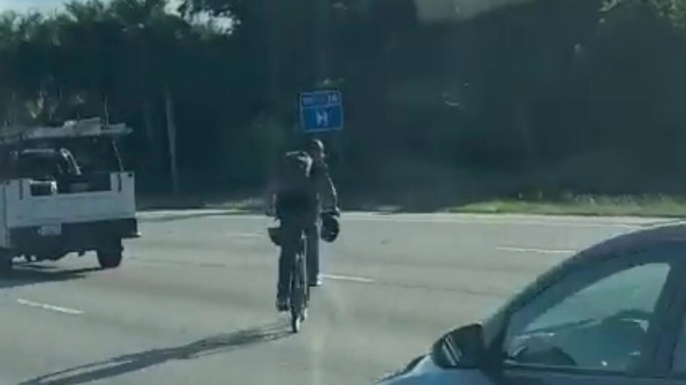 Op de snelweg kom je van alles tegen, maar fietsers zie je er gelukkig niet zo vaak. Maar goed ook, want deze mafkees bewijst in Florida dat dat inderdaad knap gevaarlijk kan zijn. Hier komt 'ie namelijk best goed weg...