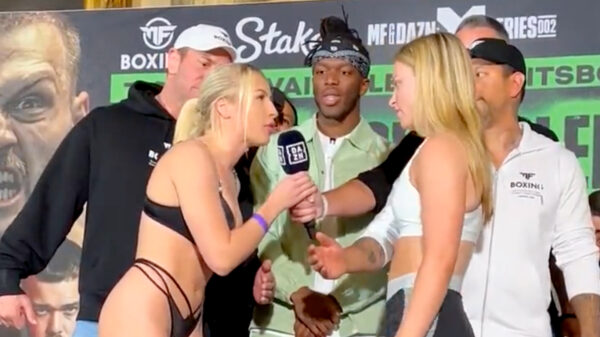 Mevrouw Wett, prima naam voor een OnlyFans-model, maakte dit weekend haar boksdebuut bij het Misfits Boxing evenement en dat heeft nogal wat gezeur opgeleverd. Na het weegmoment stonden ze oog in oog met haar rivale Keeley Colbran en probeerde uit het niets KSI (bekende Youtuber) te zoenen. Daar was hij blijkbaar niet van gediend en dogde deze aanslag vakkundig door zijn hoofd weg te trekken.