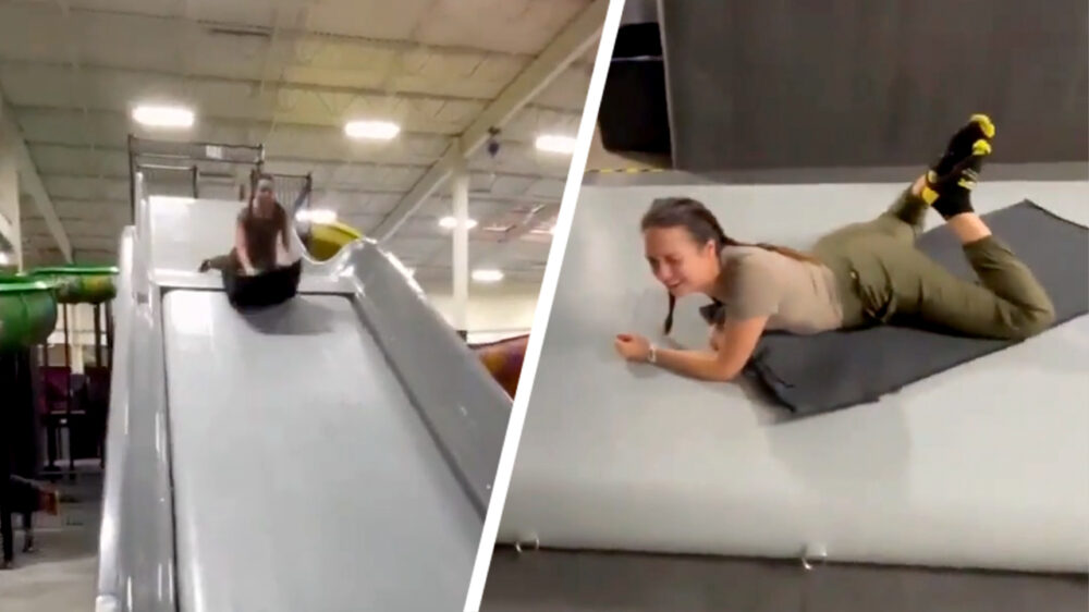 Mama doet wel even voor hoe je soepeltjes van een glijbaan gaat