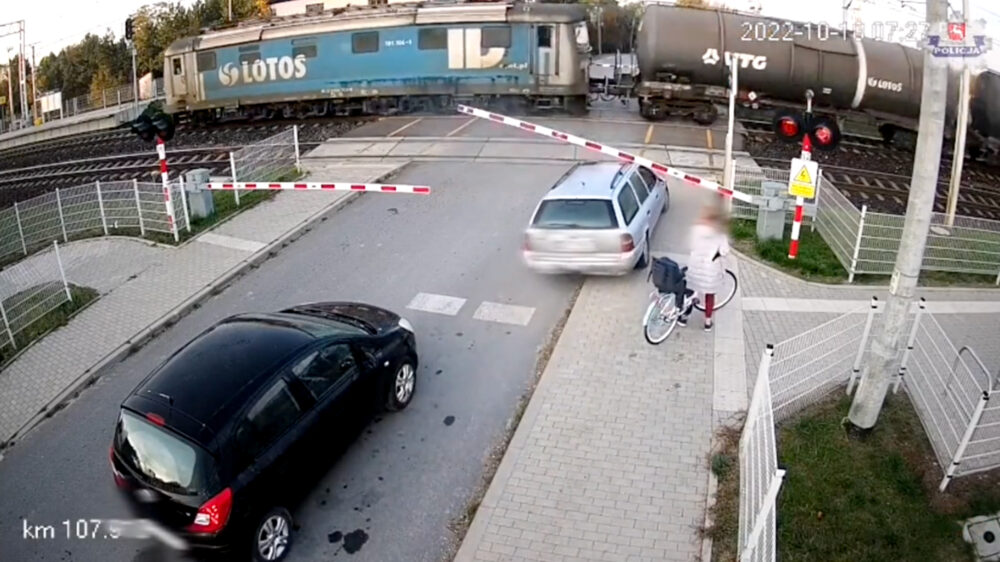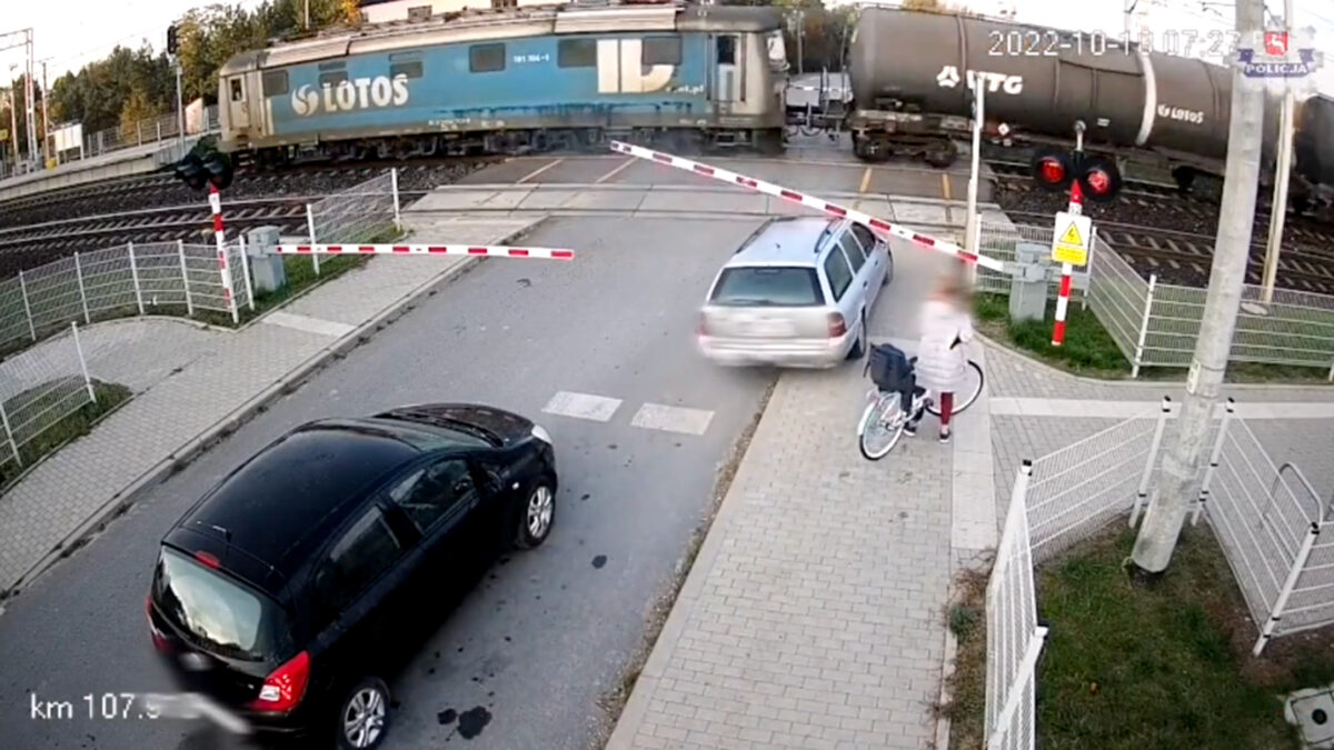 Poolse automobilist jankt dwars door slagboom en beukt tegen passerende trein