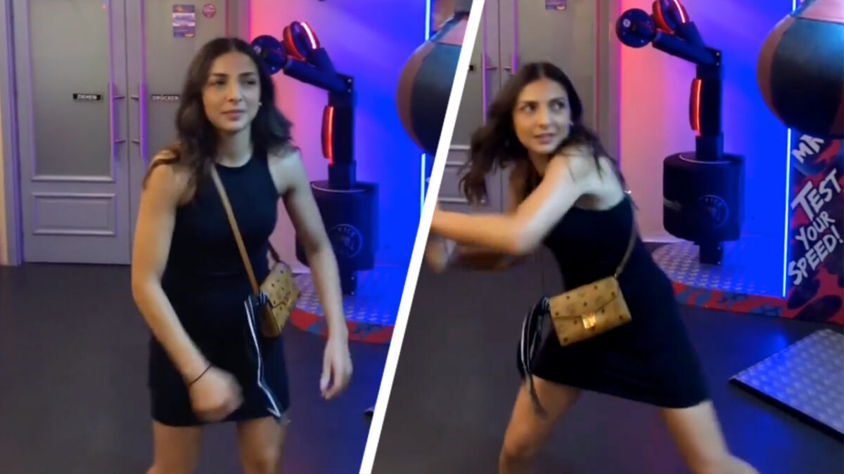 Een op het oog onschuldige jongedame demonstreert op een boksbalmachine dat er met haar niet te spotten valt. Kort, maar krachtig...