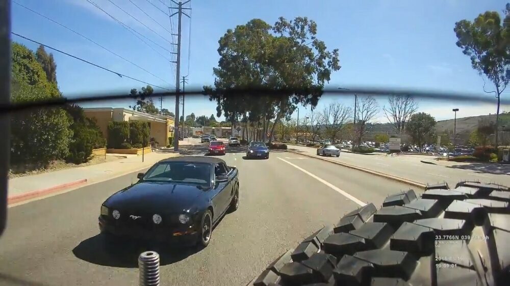 Waarschijnlijk was hij aan het dagdromen of bezig met zijn telefoon, maar de Jeep waar hij achterop knalt zal er niet wakker van liggen. Hey, er zit wat blauwe autolak op mijn godsgruwelijk immensgrote achterbumper!