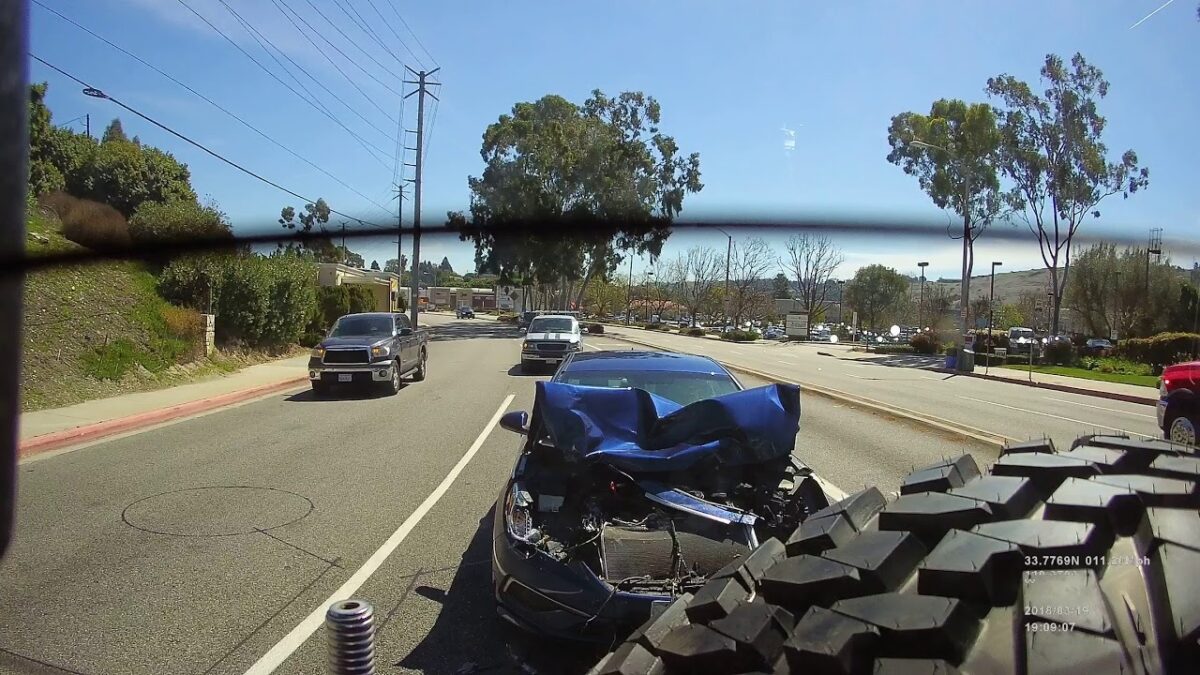 Waarschijnlijk was hij aan het dagdromen of bezig met zijn telefoon, maar de Jeep waar hij achterop knalt zal er niet wakker van liggen. Hey, er zit wat blauwe autolak op mijn godsgruwelijk immensgrote achterbumper!