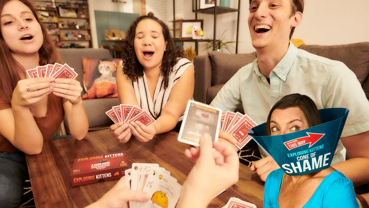 1 van 13 de uitbreidingen is de variant Imploding Kittens, waarbij de "Cone of Shame", oftewel de "schaamkraag" hoort. Verliezers lopen de kans dat ze deze kraag op moeten zetten zodat je je er extra van bewust bent dat je verloren hebt (en voor lul staat). Lekker toch... 😆