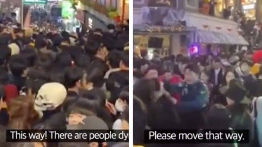 Beelden van een crowdmanager laten zien hoe hij tevergeefs, in zijn eentje, de enorme menigte probeerde aan te sturen en te waarschuwen. Zuid-Koreaanse autoriteiten onderzoeken nog wat er precies is gebeurd.
