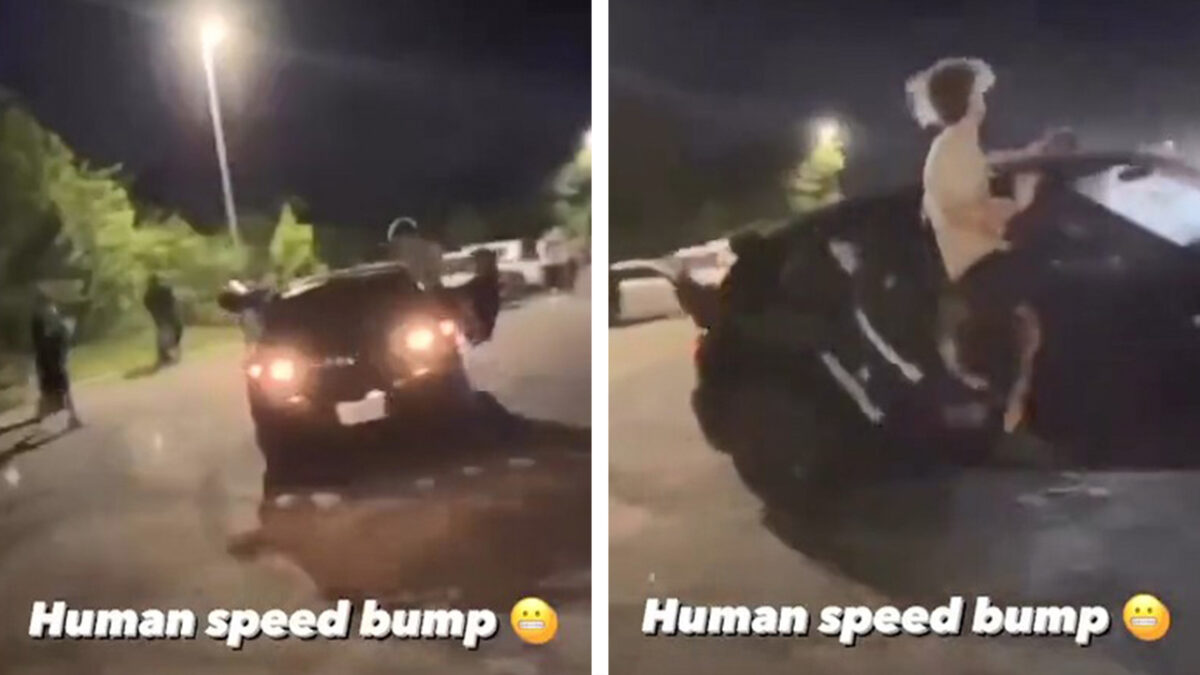 Kerel wordt uit de auto gedrift en verandert in een menselijke verkeersdrempel