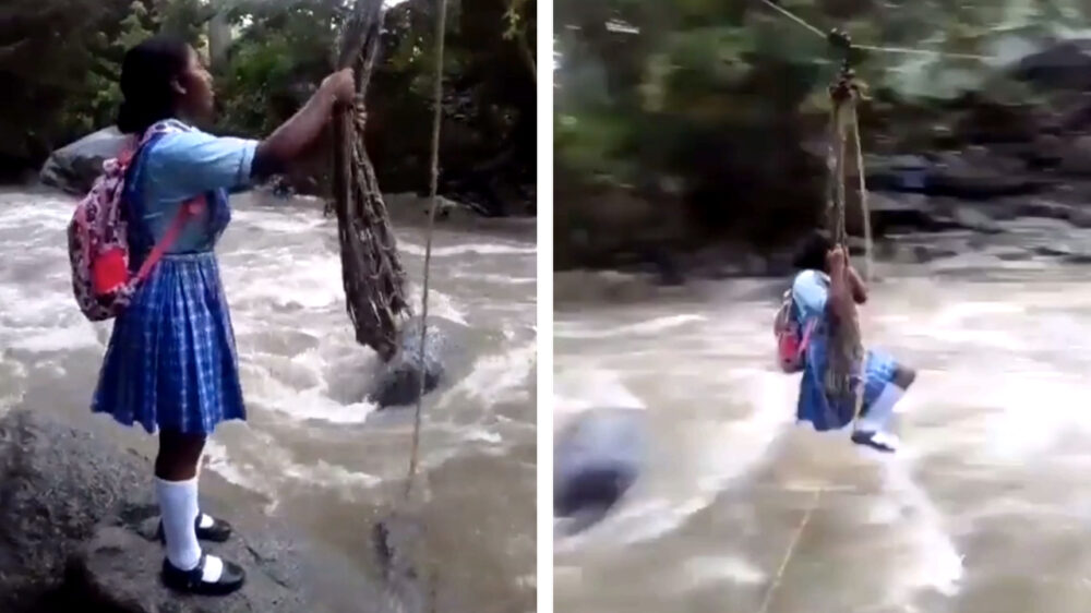 Als het hier ook maar een klein beetje regent hebben ze er eigenlijk al geen zin meer in, maar deze jongedame steekt in haar schooluniform een kolkende rivier over.
