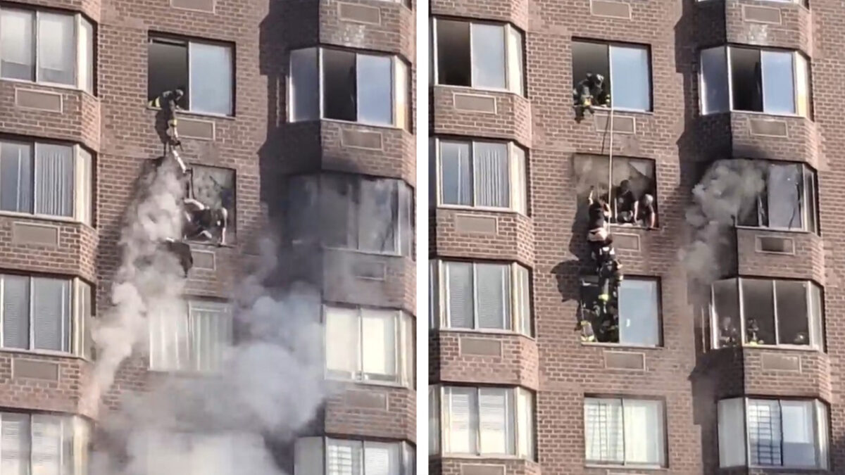 Brandweer New York redt vrouw die uit raam van brandend flatgebouw bungelt