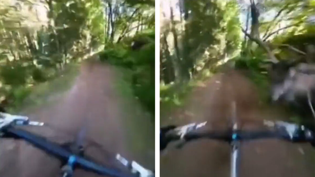 Chagrijnig hert beukt fietser omver die volle bak over een bospaadje raast