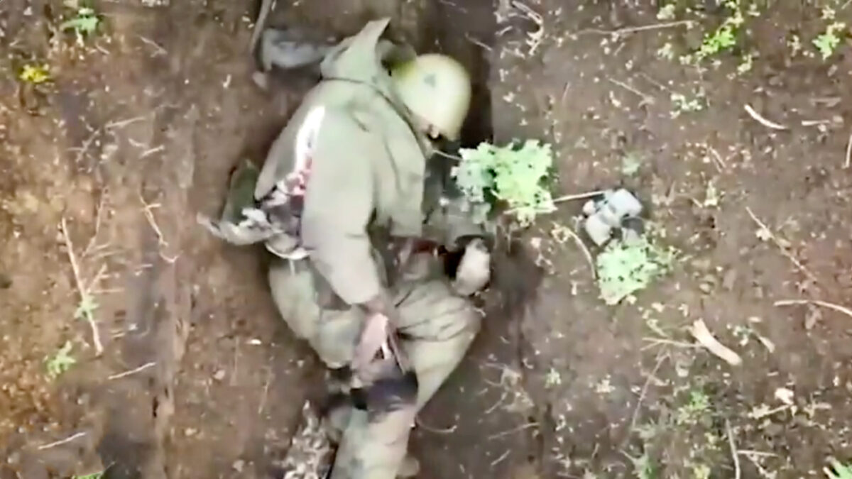 Drone mikt granaten op gewonde soldaat in loopgraaf die ze stoïcijns weggooit