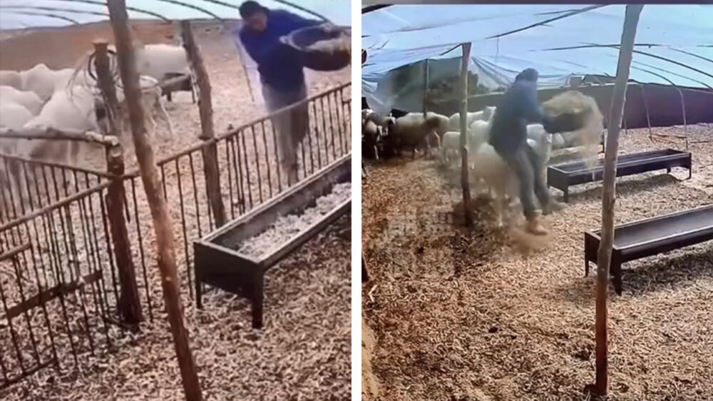 Een beveiligingscamera legde vast hoe een boer steeds de dupe is van één lijpe ram die met de nodige opgekropte woede kampt. Eerlijk is eerlijk; die laatste uitbarsting was ronduit smerig.