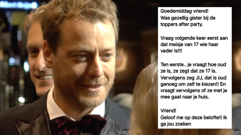 Het was blijkbaar een gezellige boel bij de afterparty van de Toppers. Zo te horen iets té gezellig, want er zijn screenshots uitgelekt (hoe dan?) van een gesprek tussen de manager van Mart Hoogkamer, Robert Schipper, en acteur Mark van Eeuwen die blijkbaar met een 17-jarig meisje aan het aanpappen was.