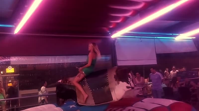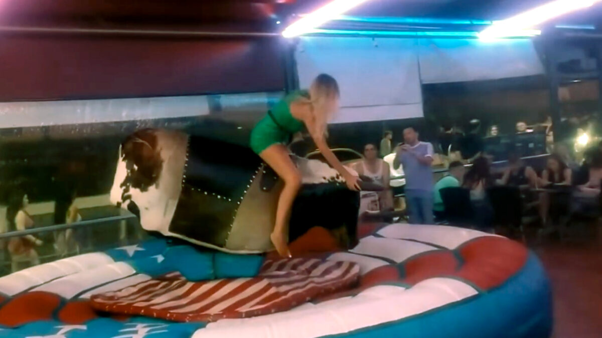 Hulde voor deze blondine die uit alles geeft om op deze mechanische stier te blijven zitten, maar we kunnen ook concluderen dat degene die hem bedient dit vaker heeft gedaan. 😅