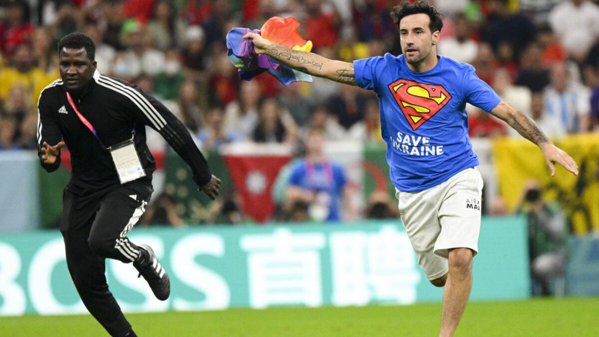 Vlaggen, shirts, petjes en aanvoerdersbanden met regenbogen erop: allemaal taboe in Qatar want homoseksualiteit en mensenrechten zijn volgens dat land natuurlijk vies, bah en onrein. Sommige mensen hebben daar echter volkomen lak aan, waaronder een demonstrant die gisteren tijdens de wedstrijd Portugal - Uruguay het veld op rende met een regenboogvlag.