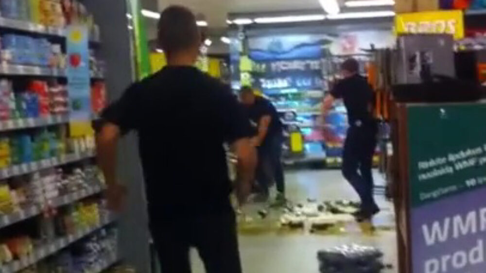 Drankmisbruik. Pure drankmisbruik. Waarom deze knakker zo tekeerging in een supermarkt in (zo naar het blijkt) Bosnië weten we niet, maar hopelijk hebben ze hem te pakken gekregen en hem een dweil in de hand gedrukt.