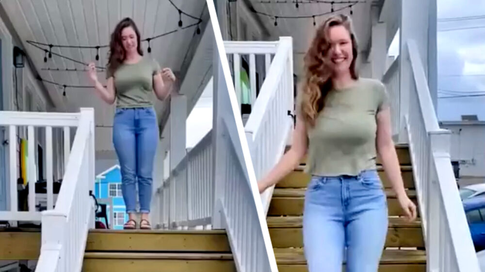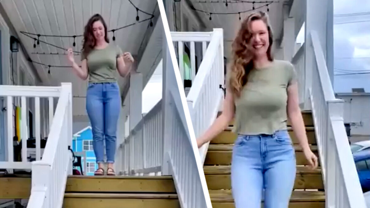 Een trap blijkt het ideale hulpmiddel voor een fatsoenlijke brassière-test