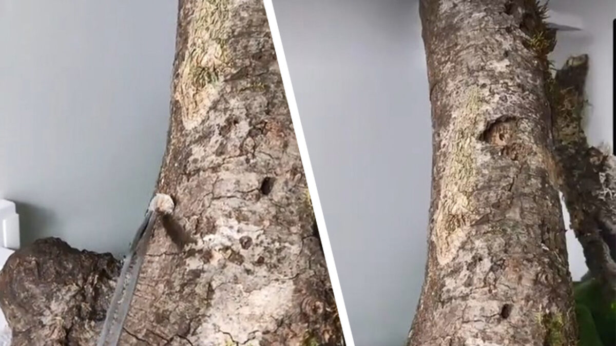 De Uroplatus sikorae is een bladstaartgekko die dankzij zijn uiterlijk aan boomschors doet denken en vrijwel onzichtbaar is als hij tegen een boom is geplakt. Aan tafel, het is etenstijd.