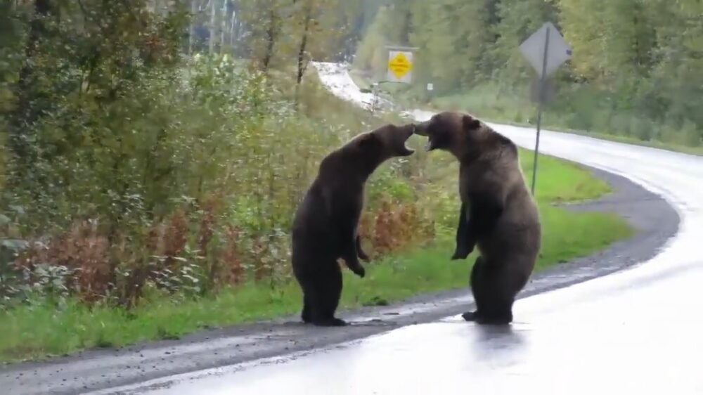 Grizzlyberen met ochtendhumeur praten meningsverschil midden op straat uit Dieren