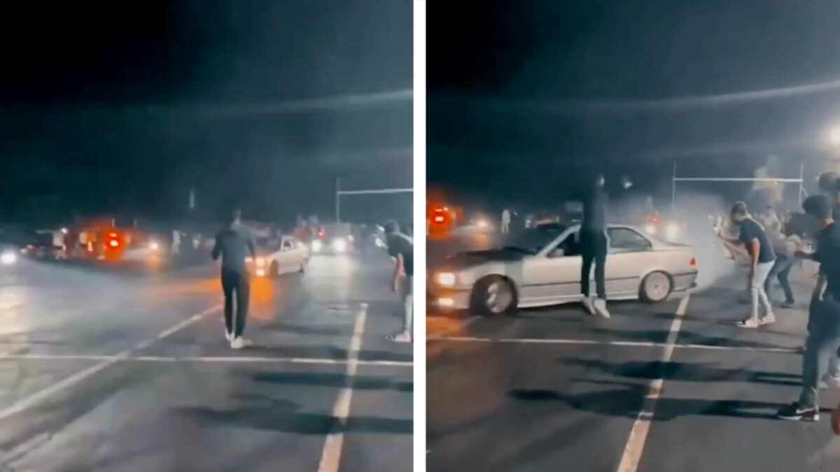Hoe vaak hebben we dit soort drift-acties op afgelegen parkeerplaatsen al fout zien gaan? Kan iedereen gewoon even naar deze vent kijken en voortaan z'n go go gadget legs gebruiken? Scheelt weer een boel gebroken poten.
